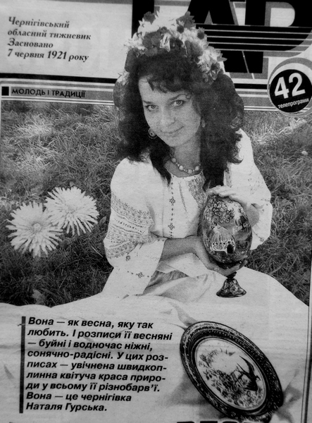 Вона — як весна, яку так любить. І розписи її весняні — буйні і водночас ніжні, сонячно-радісні. У цих розписах — увічнена швидкоплинна квітуча краса природи у всьому її різнобарв’ї. Вона — це чернігівка Наталя Гурська.