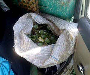 О п'ятій годині ранку нарядом був зупинений автомобіль „Москвич-комби" в салоні якого, крім водія, перебувало ще чотири пасажири. При зовнішньому огляді автомобіля в ногах трьох пасажирів, які сиділи на задньому сидінні, були виявлені два мішки з маком. В кожному мішку знаходилось близько 7 кілограмів маку.