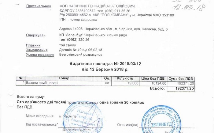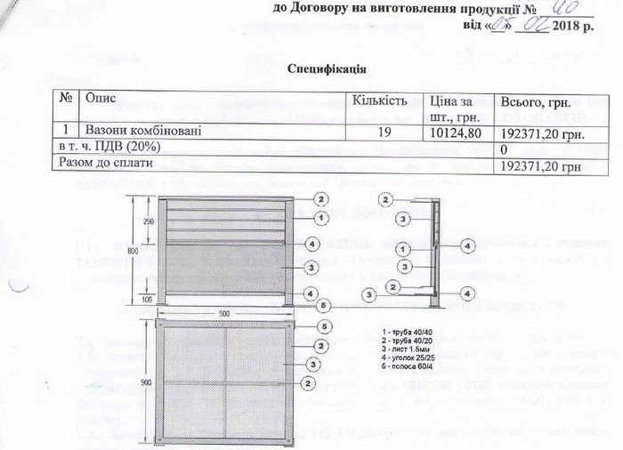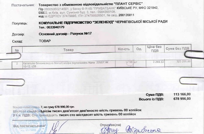 98 ящиков под катальпы, под названием «комбинированые вазоны», КП «Зеленстрой» партиями по 19, 15 и 10 штук, дабы не превышать порог в 200 тысяч гривен, закупило у ФЛП Насенника Геннадия Анатольевича по цене 10 124.80 грн. за 1 вазон.