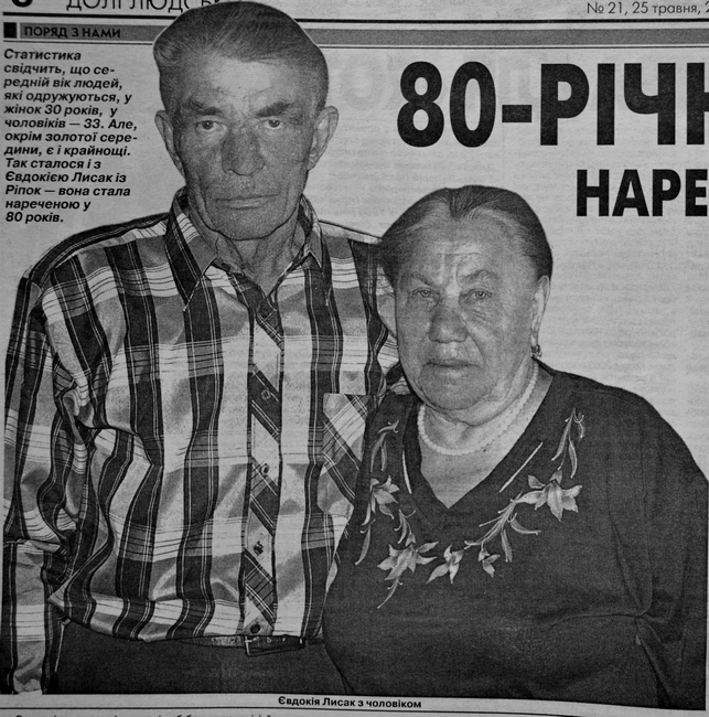 — Як сталося так, що я вийшла заміж? Ми з Миколою вже більш ніж ЗО років разом живемо, відтоді як я повернулася з Казахстану до Ріпок. Чекала я, чекала, доки він запропонує руку та серце, а він навіть і не намагався цього зробити, хоч і казав, що кохає. Врешті-решт я не витримала і кажу йому:„Миколо, може, одружимось? Все-таки 30 років чекаю, доки ти наважишся!” А він не погоджується. Каталізатором же нашого одруження стало те, що я учасник Великої Вітчизняної і мені держава надає пільги щодо оплати квартири, різних послуг, а моєму чоловікові — ні. Тож для того, щоб ці пільги поширювались на обох, довелось одружитись. Отак я його на собі женила.