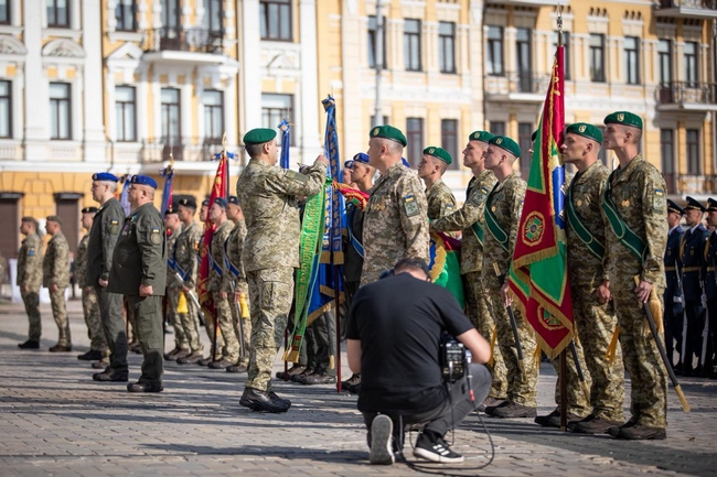 На Софійській площі в Києві, з нагоди святкування Дня Державного прапору України, відбулася церемонія присвоєння почесних найменувань ряду бойових військових частин Збройних сил України, Національної гвардії та Державної прикордонної служби України.