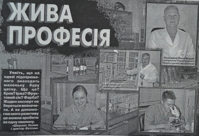 Так уже склалося, що у День медичного працівника преса про судових медиків si адує нечасто. Можливо, тому, що у повсякденному житті ми зустрічаємося з ними значно рідше, ніж з терапевтами чи окулістами. Проте чули про таку професію, без сумніву, всі, чому значно посприяли детективна література і кіно. Але ж чи всі мають правильне уявлення про роботу судме-дексперта? Дозвольте висловити у цьому сумнів. Детективні фільми та романи переповнені персонажами, котрі іменуються судовими медиками, однак протягом усього сюжету займаються справами, які до судової медицини жодного відношення не мають. Чарівна Зіночка Кібріт із серіалу «Слідство ведуть знатоки» однаково добре розуміється і на фальшивих купюрах, і на резус-факторах. Хоча насправді мала б розумітися лише на чомусь одному. Про не менш чарівного агента ФБР Скаллі із «Секретних матеріалів», яка частіше хапається за пістолет, аніж за скальпель, взагалі нема чого говорити. Доктор Ватсон ні в оповіданнях, ні у фільмах не для Шерлоку Холмсу жодної медичної поради, зате сам Шерлок Холмс. .. Ось він-то, винаходячи реактиви, за допомогою яких можна відрізнити кров від томатного соку, і займався тим, чим судовим медикам належить займатися. Все значно простіше, ніж у кіно. Вистежують і ловлять злочинця оперативники . Викриває підозрюваного у злочині на підставі волосини, знайденої на місці події, слідчий. Але довести, що ця волосина раніше була частиною зачіски саме цього затриманого, який завзято заперечує свою провину, має судовий медик. Фальшивими ж грішми та інопланетянами займаються зовсім інші експерти.