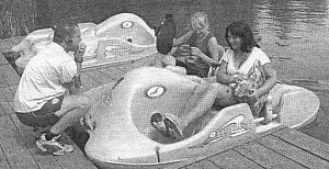 — Кредит еще не отдали. Полчаса катания по зеленой глади Стрижня стоит в будни —15 гривен с человека. Это если катаетесь до 16 часов. Водная прогулка вечером и в выходнье стоит 20 гривен. Посредине между сиденьями можно пристроить и ребенка бесплатно. Ну как тут не попробовать? Подходим к желтому канадцу. Спаситель, кандидат в мастера спорта Олег Скворцов проводит короткие инструктажи как сидеть, чем рулить. И вперёд. Сперва кажется что крутить педали будет тяжело. Хорошая зарядка. Но ноги быстро привыкают, к тому же гнать то не обязательно. После нескольких неправильных поворотов рулить тоже можно приспособиться. Проплываем мимо дикого пляжа. В мутной воде плещутся подростки, взрослые, детишки с родителями. Проплывают пластиковые бутылки, ветки.