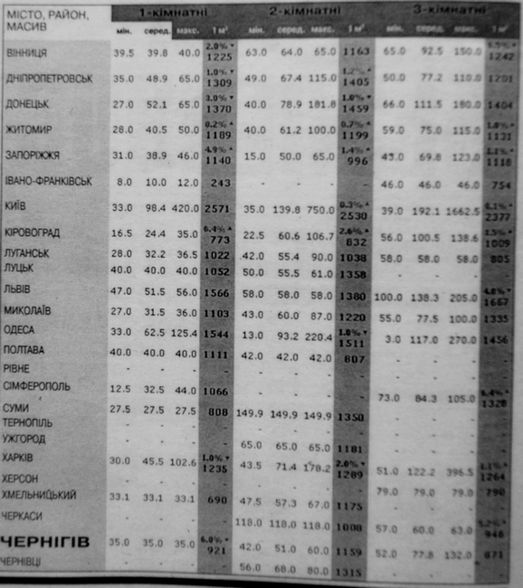 Вартість 1 кв.м зазначена у доларах США, вартість квартир — у тисячах доларів США.