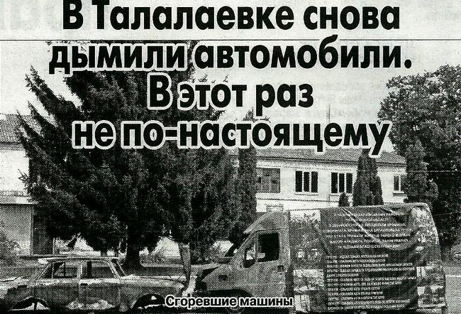 Ровно год назад в Талалаевке проводилось несколько мирных акций, участники которых требовали от правоохранительных органов раскрытия целого ряда преступлений — поджогов имущества и автомобилей, грабежей. Пострадавшие активисты обвиняли районную власть в бездействии. Прошел год, но, к сожалению, ни одно из этих преступлений так и не раскрыли! Зато сгорели еще два автомобиля: осенью — у активиста, депутата Талалаев-ского поселкового совета Григория Филина и 27 июня — у свободовца, местного музыканта Олега Галагана. Старенький «москвич», так сказать, слова доброго не стоил. Но от него загорелся дом. Только случай спас от гибели семью, в которой воспитывается несовершеннолетний ребенок.