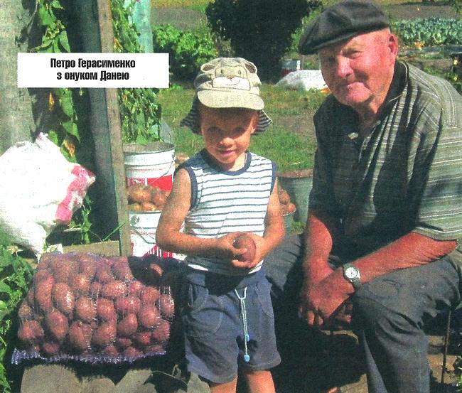 81-річний Петро Герасименко з дружиною, 77-річною Надією Михайлівною, набирають картоплю в сітки. Допомагати приїхали з Ніжина дочка Галина з зятем Миколою і трирічним правнучком Данею.