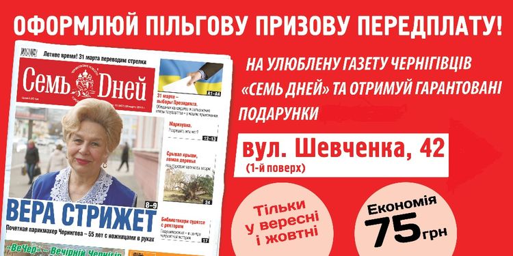 ИНТЕРЕСНО Газета «Семь дней» объявляет «мобилизацию читателей» с призами и подарками. Начало осени – это не только о школе, грибах и заготовке запасов на зиму. Это еще и старт нового подписного сезона. Традиционно любимая газета черниговцев «Семь дней» предлагает самым преданным своим читателям, которые не хотят медлить, оформить подписку на любимую газету по наиболее выгодной цене.