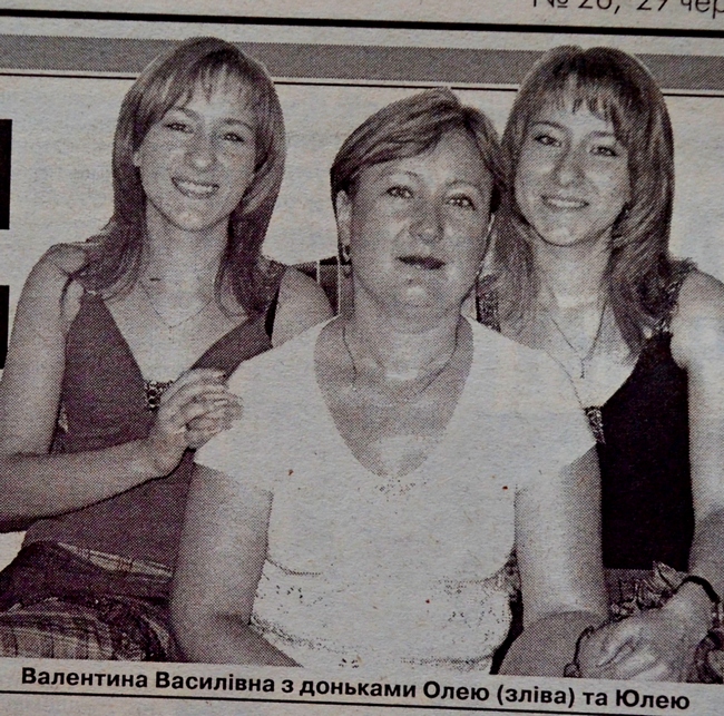- Я не лам ятаю, коли бачила їх поодинці, вмовляла хоча о фах різний вибрати, але доньки не згодились зі мною: „Що ми будемо робити одна без одної?" — розповідає жінка. — Так із самого дитинства. Я накидаю їм іграшок сидять удвох, граються і не чутно їх. Щоправда, якось коли мене не було вдома, таки нашкодили — скинули квітку з підвіконня, а черепки зібрали у купу, було їм тоді по два роки А більше жодних проблем з ними не було. Доньки добре вчилися. Юля, вона меткіша за сестру, золоту медаль отримала. Оля ні, але також непогано закінчила школу. Уїлколі дівчата брали участь у художній самодіяльності, якщо вчителі просили допомогти — не відмовляли... А 16 років тому лікарі не могли гарантувати, що вони житимуть. Я народила доньок семимісячними: Оля важила кілограм, Юля — 900 грамів. Мені навіть не показали їх, відвезли до Києва, бо тільки там була апаратура для рятування таких дітей. Вперше побачила донечок тільки через місяць, вони здалися мені такими маленькими, що навіть підійти до них боялася...