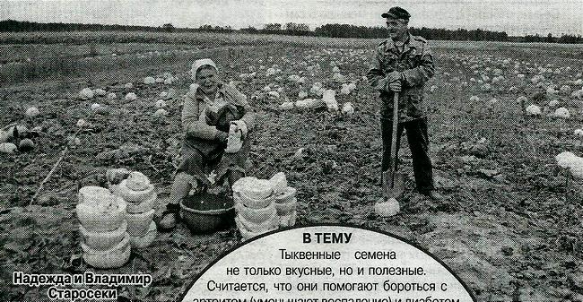 Проезжали мы 5 сентября Ивановку Семеновского района и удивились: там едва ли не каждый огород устлан тыквами. На первом, при въезде в село, трудились супруги Старосеки. 68-летний Владимир Егорович складывал тыквы в кучи и разрезал их пополам, а 66-летняя Надежда Петровна выбирала семечки.