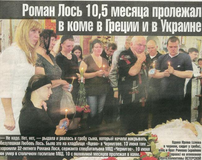 — He надо. Нет, нет, — рыдала и рвалась к гробу сына, который начали накрывать, безутешная Любовь Лось. Было это на кладбище «Яцево» в Чернигове. 13 июня там хоронили 32-летнего Романа Лося, сержанта спецбатальона МВД «Чернигов». 10 июня он умер в столичном госпитале МВД. 10 с половиной месяцев пролежал в коме.