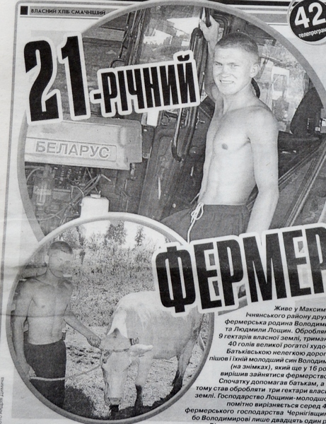 Живе Максимівці Ічнянського району дружна фермерська родина Володимира та Людмили Лощин. Обробляють 9 гектарiв власної землі, тримають 40 голів великої рогатої худоби. Батьківською нелегкою дорогою пішов їхній молодший син Володимир (на знімках), який ще у 16 років вирішив займатьсь фермерством. Спочатку допомагав батькам, а рік тому став обробляти три гектари власної землі. Господарствоо Лощини-молодшого помітно вирізняеться серед 471 фермерського господарства Чернігівщини, бо Володимирові лише двадцять один рік. Він - наймолодший фермер області.
