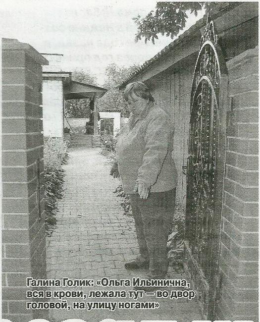 — Галина Викторовна позвонила мне примерно без двадцати двенадцать дня, — продолжает Галина Позняк. — Я приехала. У Ольги Ильиничны голова была — сплошная гематома. Травмы нанесены тупым предметом и ножом. Потом я рассмотрела еще и ранения грудной клетки, но непроникающие, поверхностные. Я вызвала «скорую», в это время приехала староста. Ольга Ильинична все рвалась домой: что с мужем, что с домом.