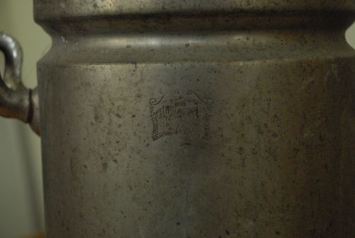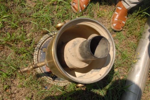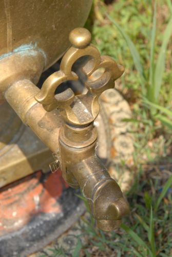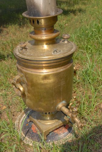 Виталий Васильевич выносит на улицу большой трактирный самовар, к которому есть специальный поддон, показывает заварной чайник, трубу для тяги...
