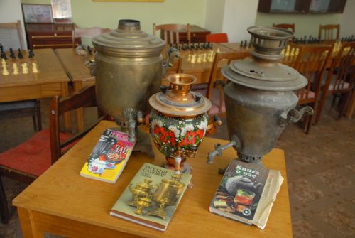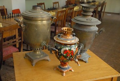 Мы уже рассказывали о его творческом спортивном проекте, согласно которому к занятиям шахматами были привлечены воспитанники детских садов Славутича. В День города был проведен первый турнир среди малышей. Тогда-то и увидел я большую коллекцию самоваров... Честно говоря, я знал, что у Виталия Васильевича есть самовары, но чтобы столько и разных — не ожидал! Пришлось напроситься на встречу с коллекционером. И встреча состоялась — в городском шахматном клубе, где размещена основная часть коллекции.