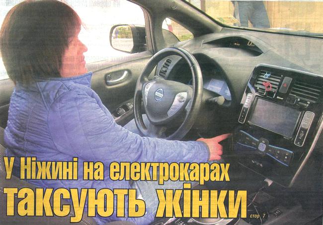 Електротаксі по Ніжину їздять поки що два. і дві жінки-таксистки. Обидві — на службі таксо-фірми «Лідер». Влітку таксофірма почала набирати таксисток для роботи саме на електрокарах. Засновник таксі «Лідер» Сергій Охонько планує пересадити на електрокари весь свій автопарк. І дівчата для таксування потрібні ще.
