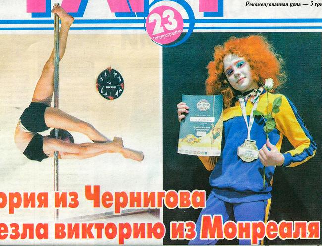 С 3 по 6 октября в Монреале (Канада) проходил чемпионат мира по воздушной акробатике. Среди спортсменок в возрасте от 14 до 17 лет чемпионкой стала 14-летняя воспитанница тренера черниговской профессиональной студии «Блэк Велвет» Татьяны Волковой Виктория Демченко (на фото).