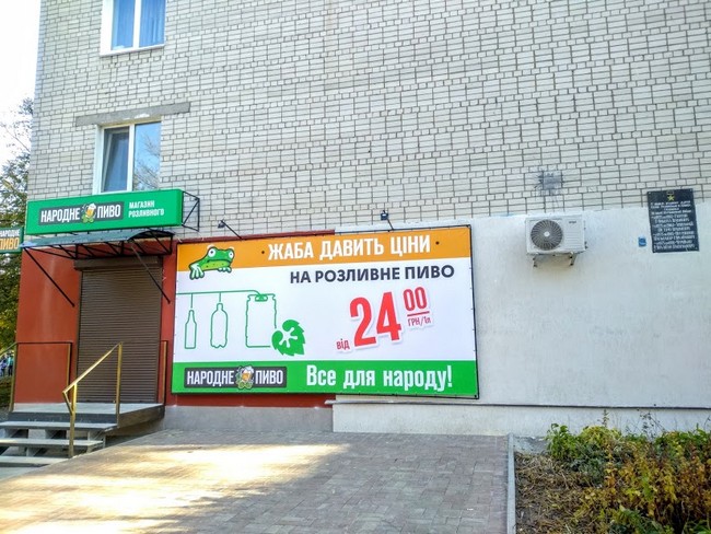 Надпись на вывеске: “Народное пиво. Магазин разливного”, "Жаба давит цены, от 24 грн. за литр на разливное пиво. Все для народа!"