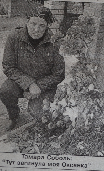 — До нас на поле, де ми з чоловіком гребли сіно, прибігла сестричка Владика Розтального Юля, — згадує, не стримуючи сліз, мама Оксанки Тамара Соболь. — „ Тітко Тамаро, ворота впали на вашу Оксану. її повезли до лікарні!" Ми все покидали й не чуючи ніг помчали до нашої лікарні. Прибігаємо й до лікаря: „Де Оксаночка? Що з нею?" А він: „Ваша дочка мертва". причиною смерті стала відкрита черепно-мозкова травма. Я не змирюся з тим, що це був нещасний випадок. Якби ворота були облаш-товані належним чином, як це зробили після смерті дочки, то трагедії б не сталося. Буду боротися, аби винних у смерті Оксани покарали.