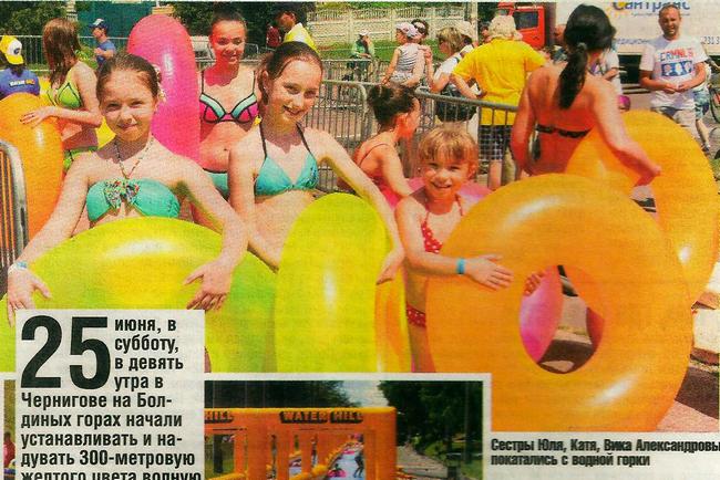 25 субботу, в девять утра в Чернигове на Болдиных горах начали устанавливать и надувать 300-метровую желтого цвета водную горку «Water Hill» с двумя трассами. Разовый спуск с горки стоил 50 гривен.