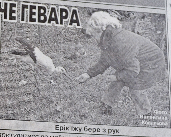 - Прийшов до школи, а наша технічка Людмила Соловей каже: „Мені один дачник приніс лелеку. Що з ним робити, не знаю. Заберіть собі". Так у моєму дворі й опинився теплолюбивий птах, — говорить вчитель. — Не знаю, чому він не полетів у теплі краї, може, від зграї відбився, а може, його вигнали одноплемінники. Назвав його Еріком на честь Ернесто Че Гевари. Коли лелека хоче їсти, то починає пищати і скрекотати. Їсть він дуже багато. Любить сало, ковбасу, але їсть не всяку, де якісна. Дістаю для нього з мишоловки мишей Ерік залюбки їх ковтає. А ще сільські дітлахи приносять йому карасів. Прикро, що він не їсть картоплі, якої у нас багато. Ночує птах із курми. Вистоїть ніч на одній нозі. У мене складається таке враження, що раніше лелека у когось жив, бо він не боїться людей, їжу бере з рук, а коли йому холодно, то намагається притулитися до моїх ніг. Навіть не знаю, що тепер з ним робити, адже в міську квартиру птаха не візьмеш, а сам він не перезимує.