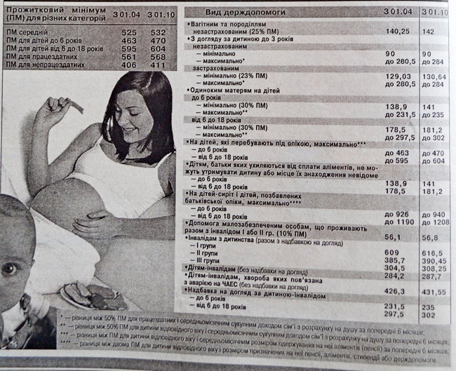Із жовтня згідно із Законом «Про бюджет-2007» набули чинності нові показники основної державної соціальної гарантії — прожиткового мінімуму (ПМ), який виріс із 525до 532грн. Разом з ПМ ав тома тично зросли і залежні від нього виплати та допомоги практично всім малозабезпеченим і соціально незахищеним категоріям населення: мамам-дек-ретницям, одиноким матерям, дітям-сиротам, дітям-інвалідам і інвалідам з дитинства, а також тим, хто за ними доглядає. У тому числі діти-інваліди отримають надбавку в розмірі 3,5-9,75 грн., інваліди з дитинства — З-7,5 грн., одинокі матері — 2,1 -2,7 грн., а ось допомога вагітним та породіллям для незастрахованих жінок ось уже кілька років залишається незмінною — 90 грн. (див. табл.). Підвищені соціальні допомоги почнуть виплачувати з 20 жовтня.