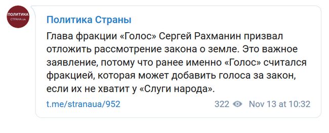 10:46 "Голосов за рынок земли нет. Голос спрыгнул. Внутри фракции тихий бунт", - пишет близкий к "Слуге народа" телеграм-канал "Темный рыцарь".