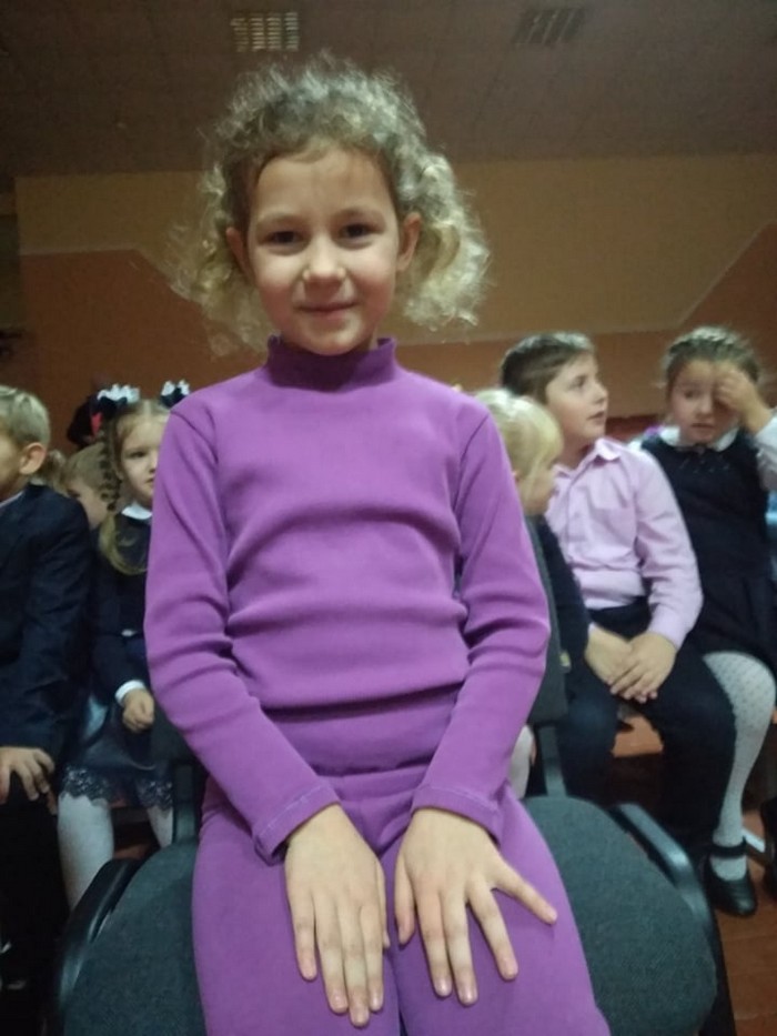 -Сьогодні день фіолетового кольору. Цей костюм мені мама пошила на вихідних. Вона в мене рукодільниця. Подивіться, у мене навіть резиночки фіолетового кольору.