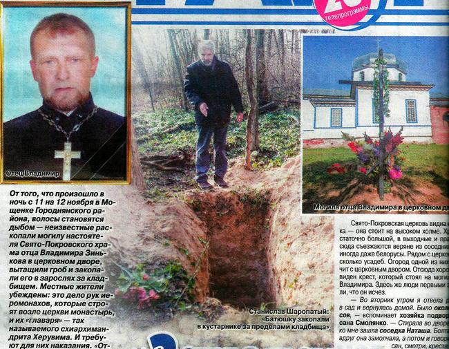 От того, что произошло в ночь с 11 на 12 ноября в Мощенке Городнянского района, волосы становятся дыбом — неизвестные раскопали могилу настоятеля Свято-Покровского храма отца Владимира Зинькова в церковном дворе, вытащили гроб и закопали его в зарослях за кладбищем. Местные жители убеждены: это дело рук иеромонахов, которые строят возле церкви монастырь, и их «главаря» — так называемого схиархимандрита Херувима. И требуют для них наказания. «Отца Владимира закопали как собаку, — возмущаются мощенцы. — Прощения тем, кто так надругался над его останками, нет!»