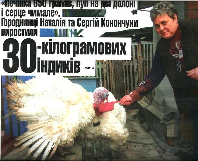 — Дивіться, 30 кілограмів!!! — Сергій Конончук, городянський підприємець, з гордістю фіксує цифру на вагах. Стільки заважив один з п’яти індиків, яких Сергій з дружиною Наталею взяли пташенятами сім місяців тому. Білі пишні індики дістають ледь не до пояса. Аби зважити таких велетнів, спеціально для «Вісника Ч» подружжя роздобуло у знайомих промислові ваги, на яких важать картоплю.