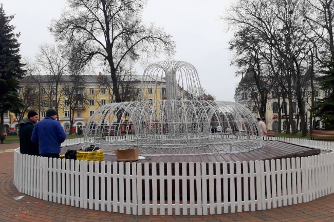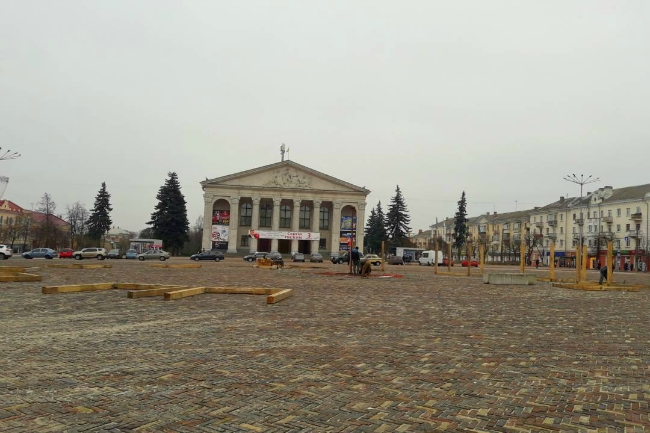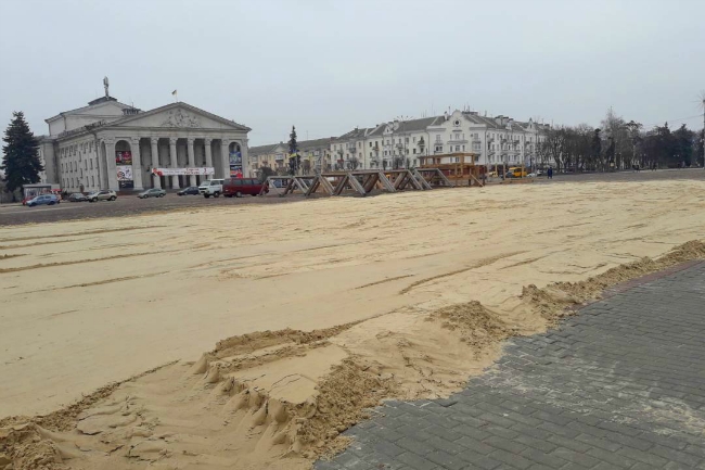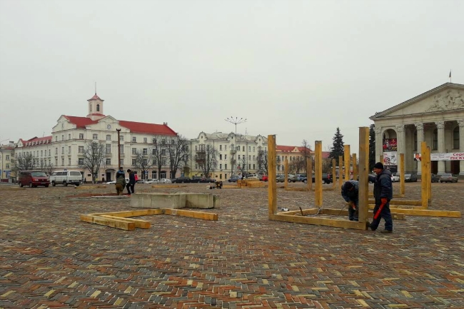 На Красній площі розрівняли пісок, який слугуватиме «подушкою» для спеціального обладнання міської льодової ковзанки. Наступним кроком буде монтаж комунікацій, а потім ковзанку заливатимуть водою. Також почали монтувати 12 декоративних будиночків.