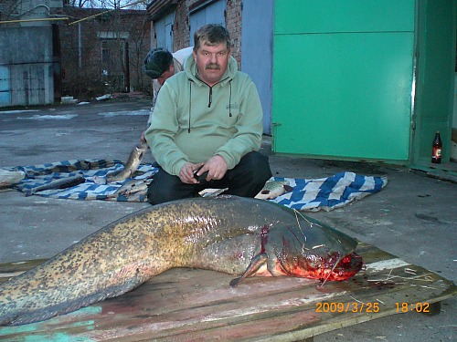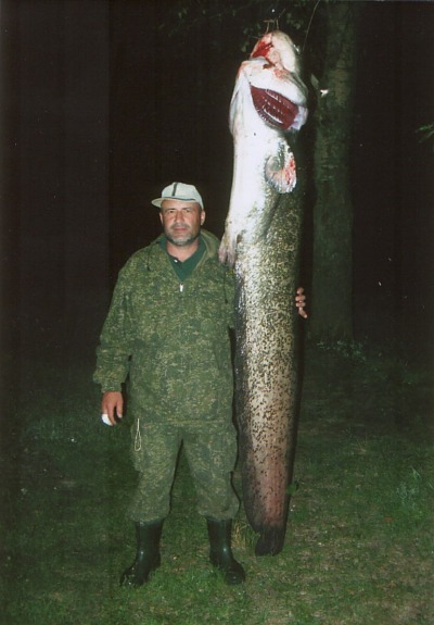 Алексанлр Андреев запечатлел счастливую минуту своей жизни. Ох и повозился же с ним, пока вытянул! Вес трофея 50 кг, пойман в 2009 году в р. Днепр.