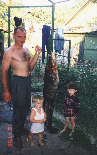 Сергей Денисенко с сыновьями. Этот сом был выловлен в 1999 году из р. Днепр на территории Черниговской области. Вес 23 килограмма. Срезанный кусок едва помещался на сковородке.