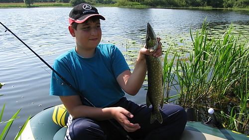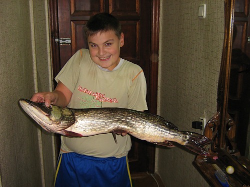 Юный рыболов-спортсмен Горваль Дима делится восторгом от своего улова: «На блесну, весом всего 5 граммов, если уметь, конечно, можно выловить такого вот хищника!»
