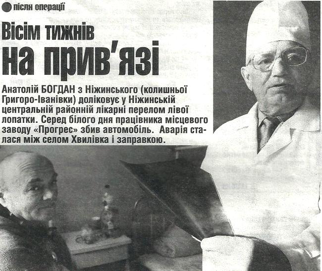 Анатолій Богдан з Ніжинського (колишньої Григоро-Іванівки) доліковує у Ніжинській центральній районній лікарні перелом лівої лопатки. Серед білого дня працівника місцевого заводу «Прогрес» збив автомобіль. Аварія сталася між селом Хвилівка і заправкою.