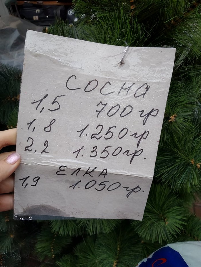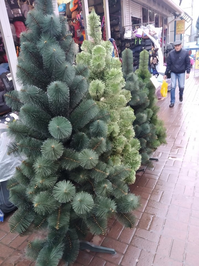 На всем рынке всего в трех местах продавали искусственные ели и сосны. Цены разные, в зависимости от качества иголок и их пышности, есть напыление или нет.