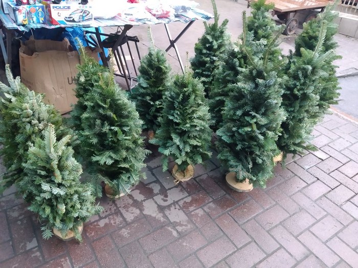 Стали искать на Центральном рынке новогодние деревья. Нашли только три точки с продажей искусственных елок и сосен, одну точку с деревьями в горшках и две точки с ветками ели карпатской.