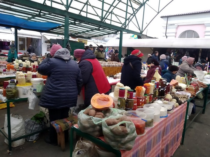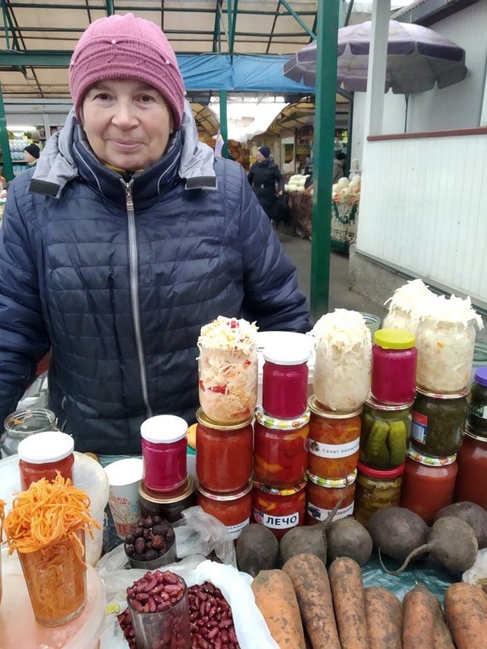 Почти нет людей и возле прилавков с домашними овощами и консервацией. Нахваливает товар пенсионерка Наталья Ивановна, которая торгует продукцией со своего огорода в Полуботках.