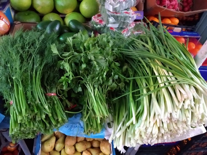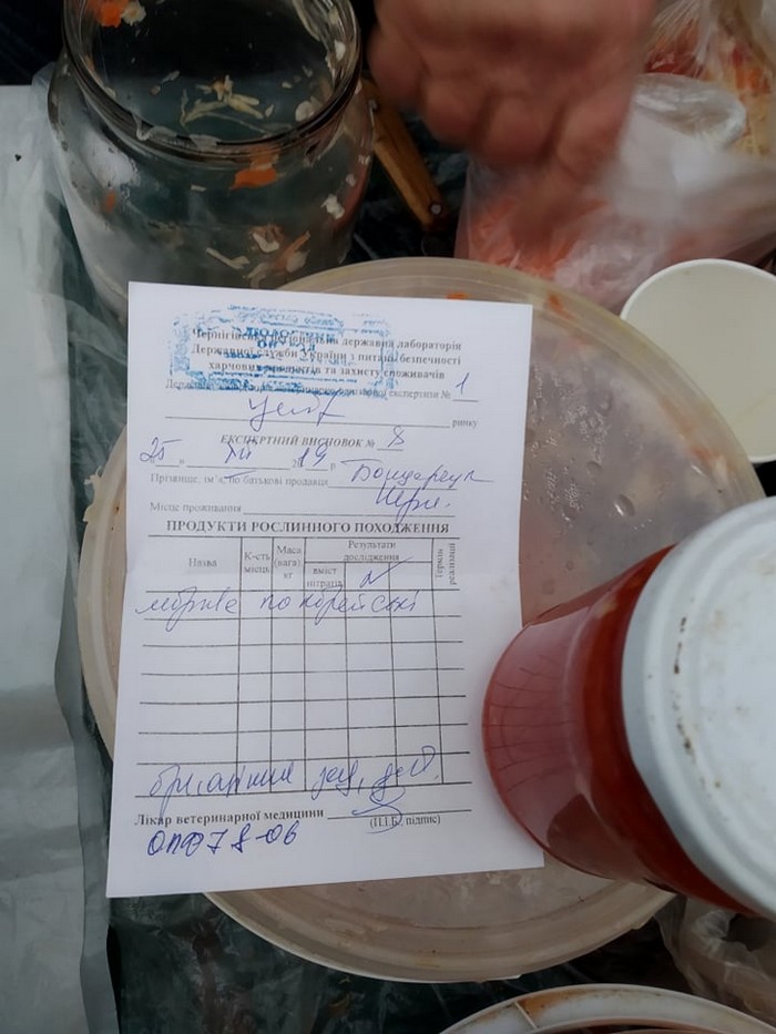 - Вот все сама готовлю, все свежее (показывает бумажку с экспертным выводом лаборатории). До 15.00 продаю, потом иду домой и до 10 вечера все наготавливаю на рынок. Капусточка квашенная 25 грн/л банка, салат с перцем 30 грн/л банка, корейская морковь 25 грн/л банка. Можно и пол литра, цена будет наполовину дешевле соответственно. Хрен 20 грн/майонезная банка, щавель 35 грн/0,5л банка. Огурчики маринованные 20 грн/0,5 л, соленые 40 грн/кг , помидоры соленые 35 грн/кг, топинамбур 40 кг/кг. Берут всего и понемногу. Очередей нет.