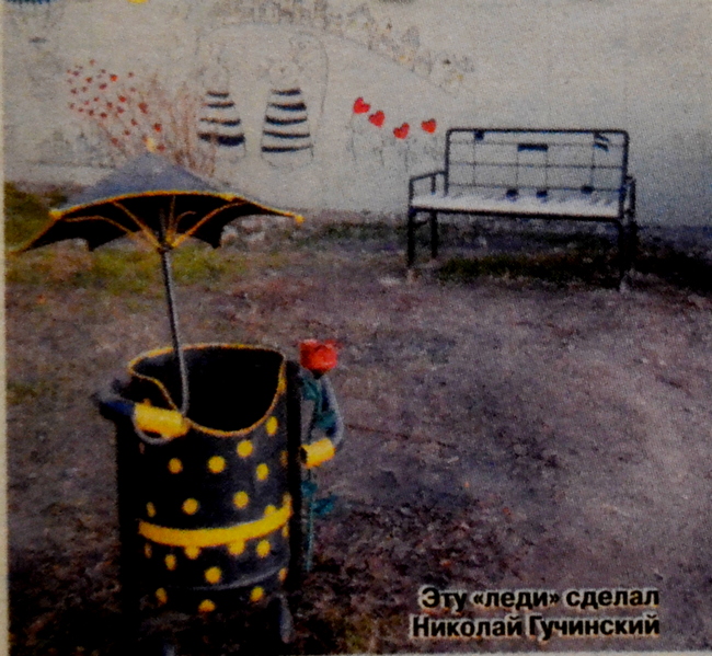 - Две из них — «джентльмена» и «леди с шляпкой»- изготовил за собственные средства Александр Паристий. А мы с единомышленниками помогли их установить, — рассказывает председатель общественной организации «Развитие Бахмаччины» Николай Гучинский. - А «леди с зонтиком» сделал и установил я. Корпус у нее - из газового баллона, остальные детали тоже металлические. На материалы ушло полторы тысячи гривен. Средства сдавали горожане — кто сколько мог.