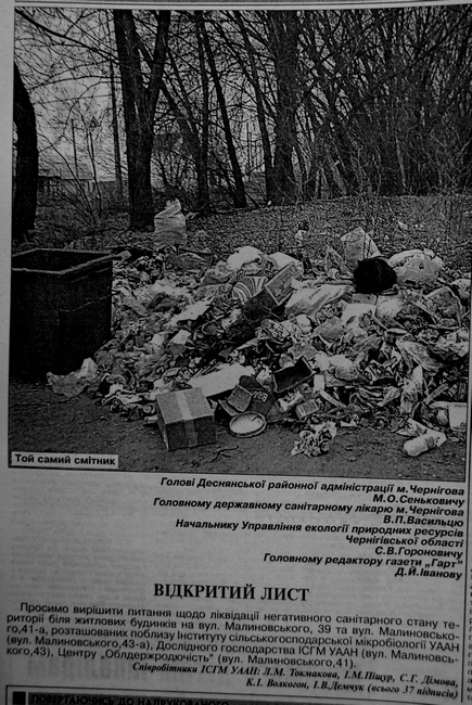Просимо вирішити питання щодо ліквідації негативного санітарного стану території біля житлових будинків на вул. Малиновського, 39 та вул. Малиновського,41-а, розташованих поблизу Інституту сільськогосподарської мікробіології УААН (вул. Малиновського,43-а), Дослідного господарства ІСГМ УААН (вул. Малиновського,43), Центру „Облдержродючість" (вул. Малиновського,41).