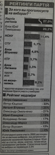 Характерно, що соцопитування іншої соціологічної фірми — «Фонду свободи» — проводилося ще за одним параметром. Респондентів запитали, за кого вони проголосували б, якби була можливість обирати прямим голосуванням голову уряду. 34,8% сказали, що за Віктора Януковича, 28,1%— за Юлію Тимошенко. У виконувача обов'язків прем’єра Юрія Єханурова значно нижчий показник: більша частина виборців «Нашої України» воліють бачити на прем’єрському посту Юлію Тимошенко.