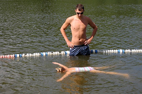 − Мы занимаемся каждые выходные с 9 утра до 3 часов дня. На водной базе ДЮСШ со мной работает еще один тренер по плаванию – Юлия Хатун. На первом занятии у нас людей было не сильно много, но потом начали приходить и не только дети, но и взрослые. Самый маленький ребенок был в возрасте 4,5 лет. А взрослые – в возрасте 20-25 лет. Конечно, детей заниматься приходит гораздо больше, чем взрослых. Маленьких детей приводят родители, а тех, кто постарше – привели в первый раз, а потом они приходят самостоятельно. Часто, пока дети где-то отдыхают, приходят одни родители. Ведь плаванию могут научить и они, просто папы и мамы должны знать, как это правильно делать. А мы им здесь не только рассказываем, но и показываем. Практически каждый, кто пришел на первый урок, продолжал посещать занятия каждые выходные. Освоив основные элементы успешного пребывания на воде, дети и взрослые не останавливаются на достигнутом и просят обучить их различным стилям плаванья. Поэтому мы, совместно с благотворительным фондом «Европа», приняли решение продлить обучение еще и на август месяц.