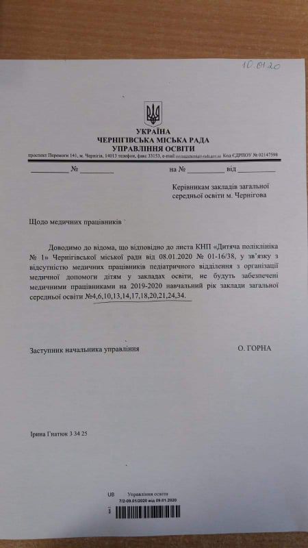 З нового 2020-го року ще 11 шкіл Чернігова залишилися без медсестер. 10 січня управління освіти розіслало директорам шкіл копію листа від КП «Дитяча поліклініка №1», де вказало, що у зв’язку з відсутністю медичних працівників заклади загальної середньої освіти №4, 6, 10, 13, 14, 17, 18, 20, 21, 24, 34 не будуть забезпечені медсестрами.