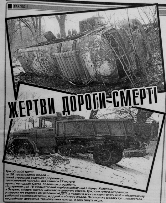 Недаремно цей 18-кілометровий відрізок шляху, що з’єднує Козелець з Остром, місцеві жителі називають дорогою смерті. Три роки тому з інтервалом у півроку тут сталися дві резонансні ДТП, в першій з яких загинули шість осіб — півколективу районної санепідемстанції, в другій — п’ятеро людей. Загалом же щороку тут трапляється і по декілька дорожньо-транспортних пригод, в яких гинуть люди.