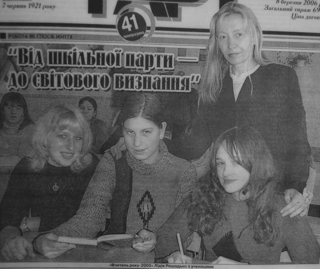 Вчителя вищої категорії Лідію Решодько директор називає надією кафедри української мови та літератури. „Уроки Лідії Іванівни зачаровують, — говорить Валентина Василівна. — З них виходиш як із казки”. Недарма на обласному конкурсі „Вчитель року-2005" саме уроки Лідії Решодько були визнані найкращими. А зараз у гімназії вже підготовлені документи для представлення Лідії Іванівни до державної нагороди — орденом княгині Ольги III ступеня. Важко в це повірити, але, будучи школяркою, а потім і студенткою Київського національного університету ім. Т. Г. Шевченка, Лідія Решодько аж ніяк не пов'язувала свого майбутнього з роботою вчителя.