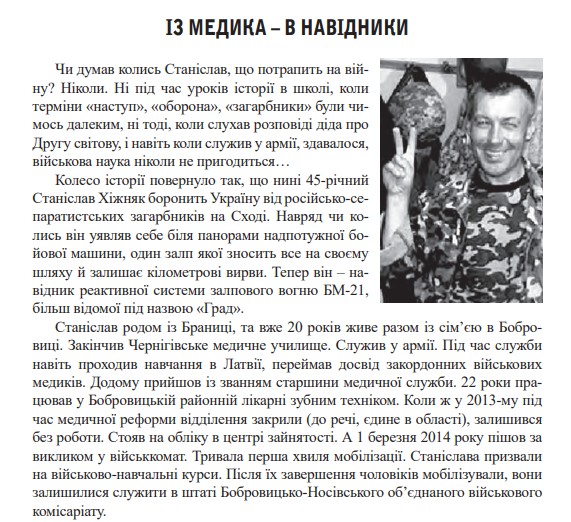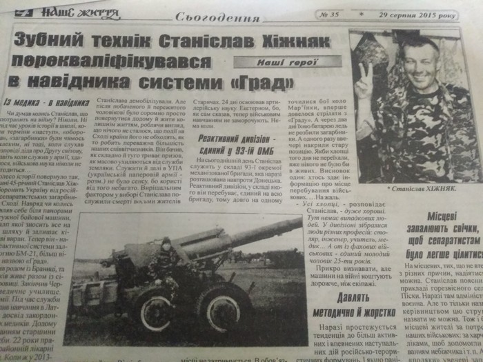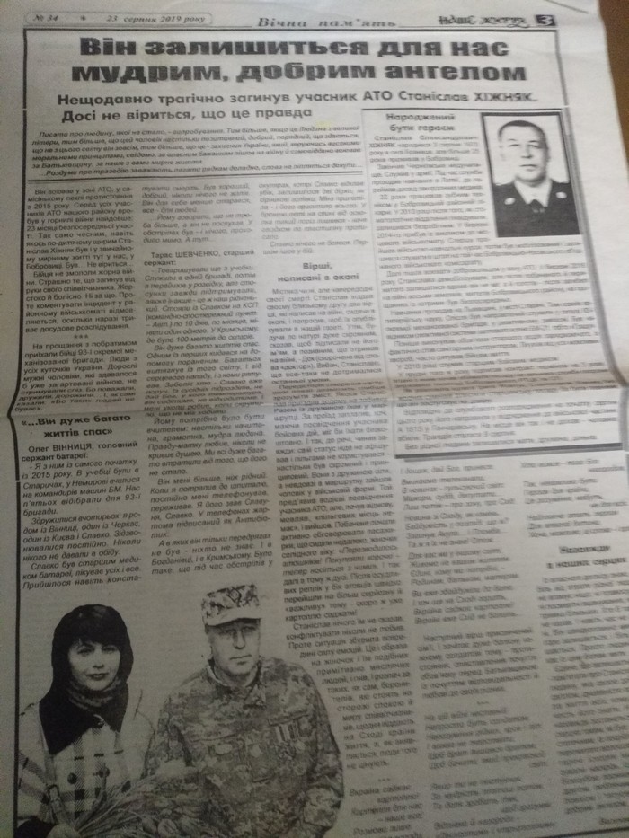 В местной бобровицкой газете "Наше життя" о Станиславе Хижняке выходили материалы. 29 августа 2015 года о том, как служится на фронте, где Станислав еже жив и улыбается и ровно через 4 года, 23 августа 2019-го года выходит статья о его похоронах.