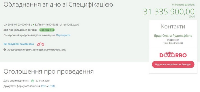 Відповідно до вказаного висновку, а також відомостей викладених на сайті публічних закупівель prozorro, зокрема за посиланням https://prozorro.gov.ua/tender/UA-2019-01-23-000745-c між Державним науково-дослідним інститутом хімічних продуктів код ЄДРПОУ 14015318 укладено договір на постачання обладнання згідно з специфікацією, з ТОВ «КОНТОРГ» код ЄДРПОУ 38271147. Так, згідно Єдиного реєстру податкових накладних безпосереднім предметом вказаного договору є постачання промислової техніки, зокрема вимірювальних комплексів, установки «ВОК «Вулкан-2005м», «маятникового коперу Zwick 5113», пресів та інших предметів вказаних у дослідженні. Відповідно до договірних умов ТОВ «Конторг» отримало на власні розрахункові рахунки грошові кошти від Державного науково-дослідного інституту хімічних продуктів, проте відповідно до відомостей викладених у дослідженні ТОВ «КОНТОРГ» не має достатньої для виготовлення даного складного обладнання кількості трудових ресурсів (працює лише 12 працівників), матеріальних ресурсів (вартість основних засобів на кінець 2018 року складає лише 244 тис. грн.), досвіду проектування і виробництва (відсутня реалізація аналогічного обладнання), а також відсутність інформації щодо його придбання на території України та за її межами. Окрім цього, розмір ймовірного завищення вартості «ВОК «Вулкан-2005м» складає понад 500 тис. гривень.