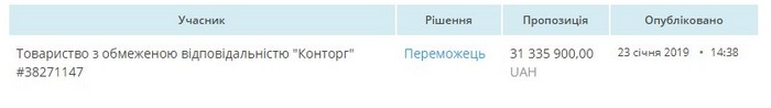Скріншот результатів тендеру з сайту Прозоро, про який йде мова в кримінальному провадженны №42019200350000035