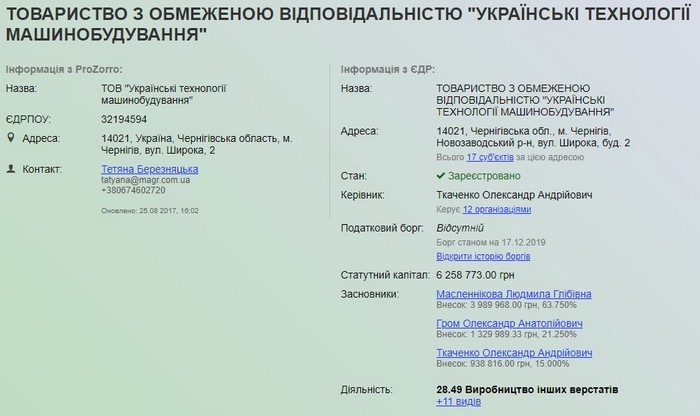 В цьому клопотанні Лисенко вказана ще одна назва підприємства, керівництво якого слідство підозрює в змові з Щербанем, а саме ТОВ "Українські технології машинобудування", яке знаходиться за тією ж адресою, що і ТОВ «Інспецпром» - Чернігів, Новозаводський р-н, вул. Широка, буд. 2, в засновниках – дружина Масленікова, а директор Ткаченко Олександр Андрійович - депутат Деснянської районної у місті Чернігові ради 7 скликання. Ткаченко 1998 році разом зі своїми партнерами заснував науково - виробниче об`єднання «Група компаній «МАГР».