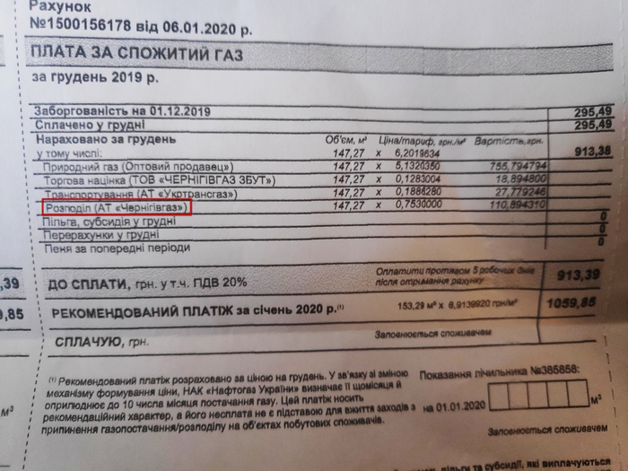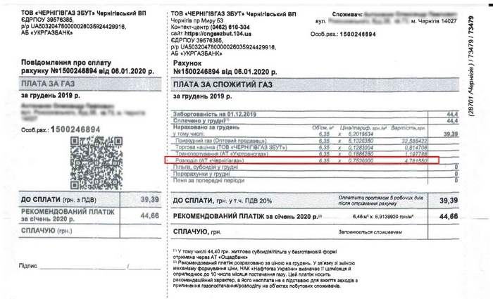 На жаль, окрім того, що введено розділ на 2 квитанції – збільшилися й ціни на розподіл газу. Для порівняння у квитанції на фото нижче за грудень 2019-го тариф на розподіл складав 0.753 за 1 метр кубічний газу при ціні самого газу для населення - 6,20196. , а отже сума за розподіл за грудень 2019 склала 110.89 грн. Як видно на квитанції розподіл газу споживач мав сплачувати по факту. Якщо спожив у грудні, як в нашому випадку 147 кубів, то мав заплатити за розподіл 75 копійок, що складало майже 7% від ціни спожитого газу.